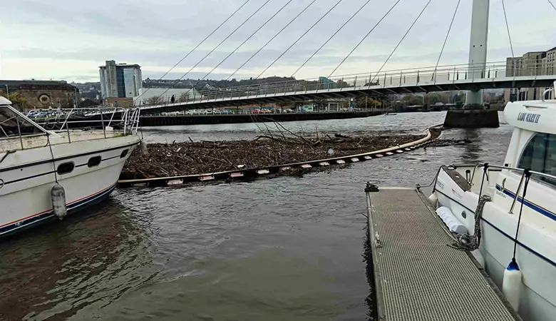 Unfortunately during the November storms and heavy rainfall. The Marina boom broke at the end adjacent to Sainsburys. Repairs and under way to the main boom. The yellow plastic temporary boom will be installed in the meantime.