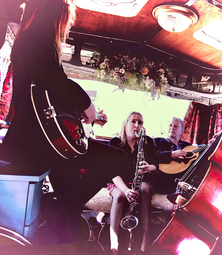 From 3pm, have fun with the Afternoon in Paris Trio.  Great entertainment, and great music with quirky vocals and eloquent clarinets enhanced by beautiful playing from the two finest guitar players in Wales. Not to be missed!